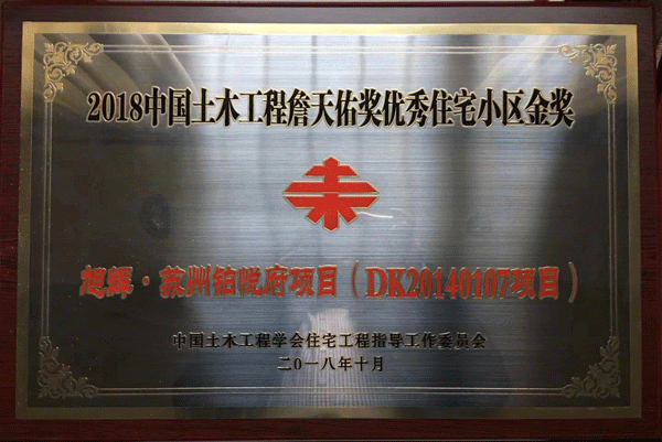 11月1日,2018年中國土木工程詹天佑獎優秀住宅小區金獎頒獎儀式在北京舉行,由達欣集團第一工程公司承建的蘇州旭輝-鉑悅府項目獲得詹天佑獎優秀住宅小區金獎。