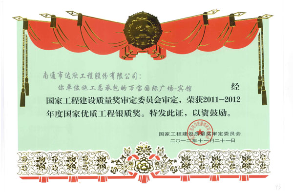我公司總承包施工的上?!叭f寶國際廣場-賓館”作為主申報單位,在先后獲得上海市“節約型”樣板工地、上海市優質結構工程、上海市“白玉蘭”優質工程后,經上海市建筑施工行業協會推薦,經國優專家組現場檢查,評審委員會評審,最終榮獲了2011-2012年度國家優質工程銀質獎。上海萬寶國際廣場-賓館項目是自公司易名以來,首次以“達欣股份”為主體的總承包申報項目。