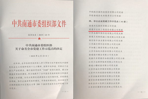 近日,南通市達欣工程股份有限公司黨委被中共南通市組織部授予非公企業黨建工作示范點稱號。