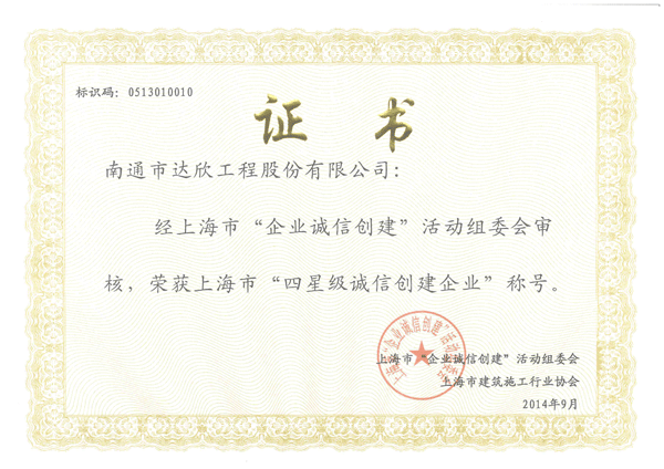 日前,由上海市建筑施工行業協會推薦,上海市“企業誠信創建”活動組委會審核,第三方征信機構嚴格查證,第一工程公司在2013年榮獲“三星級誠信創建企業”后,今年再加一顆星,被授予上海市“四星級誠信創建企業”稱號。
