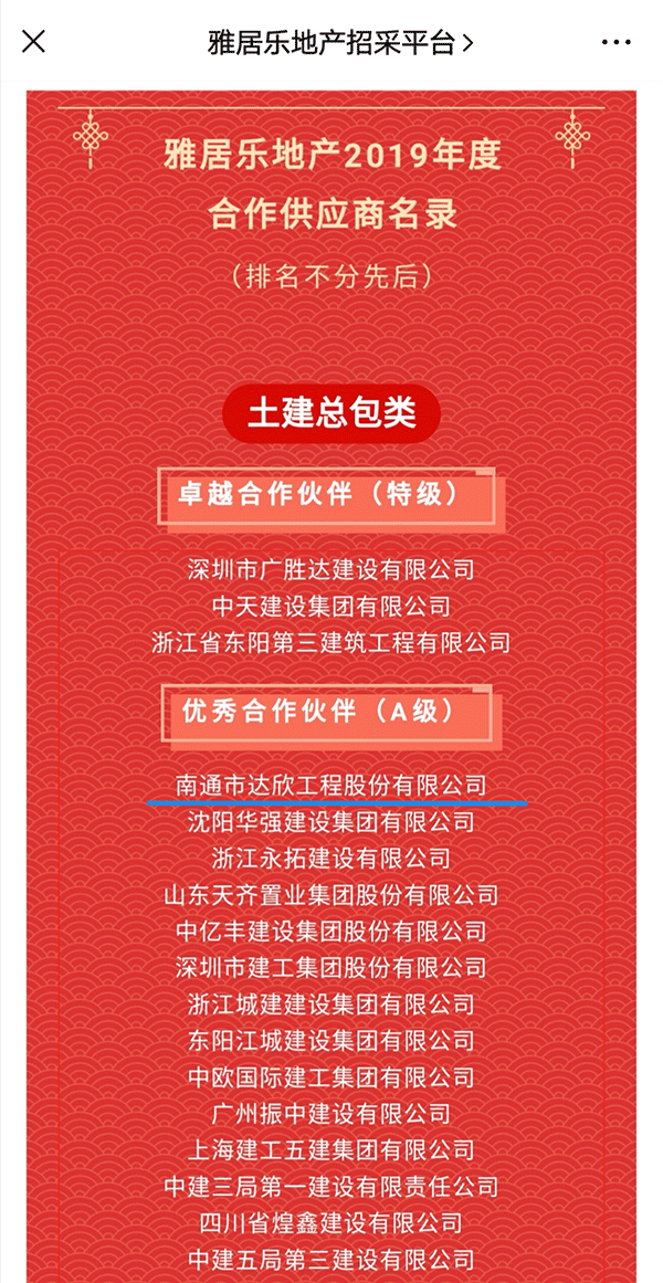 4月8日,雅居樂地產首次微平臺公布了2019年度合作供應商名錄,我公司從2018年首次與雅居樂地產合作以來,上下高度重視,以精益求精的質量行為,多次在第三方檢測中名列前茅,得到業主的充分肯定,榮升土建總承包優秀合作伙伴A級,為雅居樂地產的提升作出了積極的貢獻。