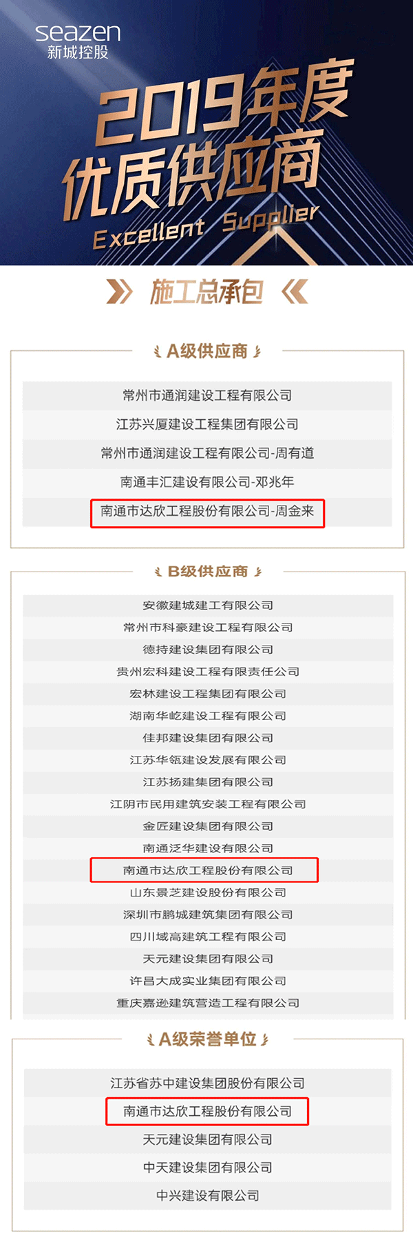 2017年,達(dá)欣集團(tuán)與新城控股攜手以來,先后連續(xù)承建了常熟紫云名邸、新城國際花都、泰興新城樾府、張家港十里錦繡、蘇州南麻鄰水灣等項(xiàng)目,累計(jì)100多萬平方米。合作的過程中,達(dá)欣集團(tuán)以實(shí)施一流管理、建設(shè)一流工程、創(chuàng)造一流業(yè)績,回報(bào)新城控股的信任和支持,努力將彼此的信任提高到一個(gè)新的高度。2019年,雙方形成“總對總”對接模式,為彼此戰(zhàn)略合作的縱深發(fā)展打開新局面。