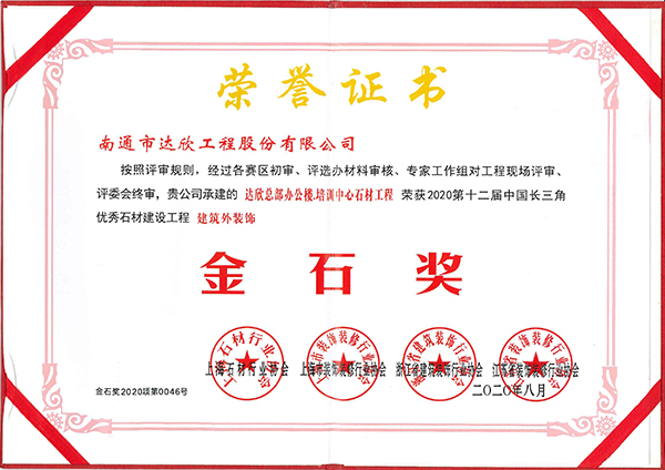 中國長三角石材建設工程“金石獎”是石材工程領域的奧斯卡金獎,達欣總部辦公樓培訓中心獲此殊榮是對該項目完美品質和公司實力的充分肯定。我們將以此為動力,繼續打造更多精品工程,為達欣的發展增光添彩。