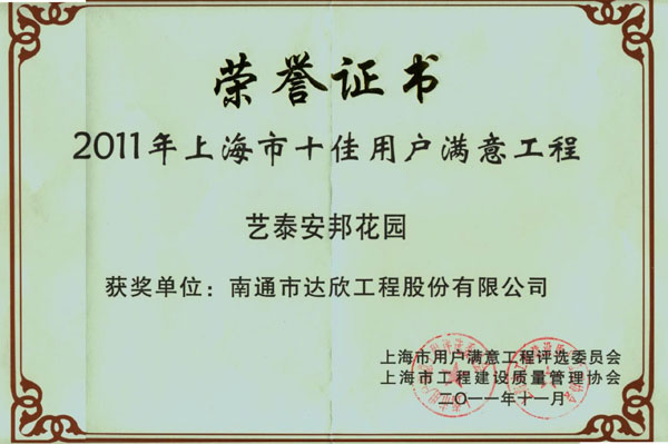 上海市“十佳用戶滿意工程”是上海市建筑業重量級獎項,是上海市在建的大型工程中,通過業主等部門使用后,選出十五項質量優秀、后期運行穩定、服務質量優秀的工程為候選單位,并在十五項候選工程中選出十項通過專家評審,方可獲得上海市“十佳用戶滿意工程”獎。獲此獎項標志著達欣公司進滬施工的信譽和業績提高到了一個更高層次,必將對持續經營開發起到良好的社會影響。