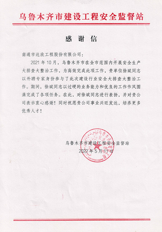 6月8日,集團收到一封來自烏魯木齊市建設工程安全監督站的感謝信,詳細內容如下: