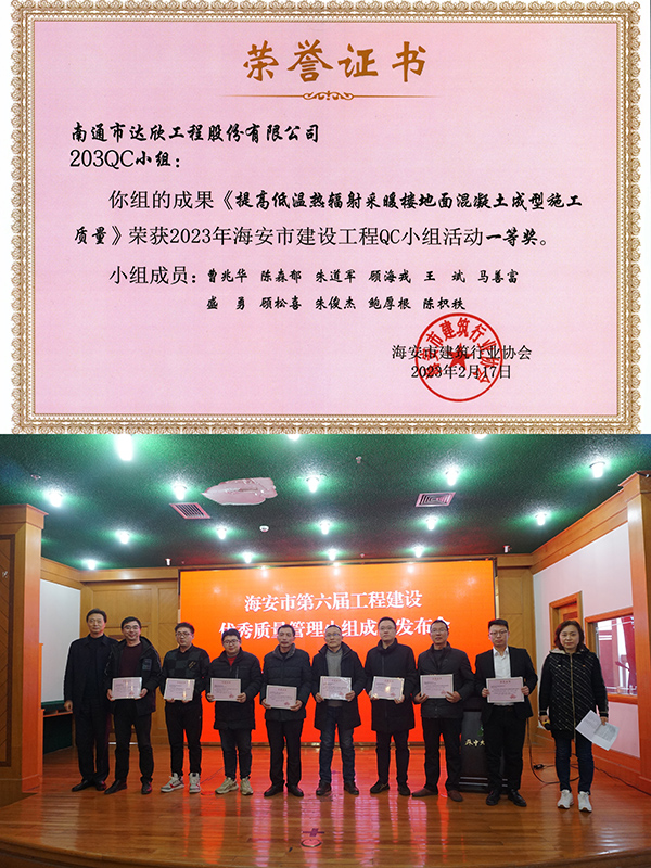 2月17日,海安市建筑業協會舉辦了海安市第六屆工程建設優秀質量管理小組成果發布會,集團選送的成果《提高低溫熱輻射采暖樓地面混凝土成型施工質量》榮獲一等獎。集團技術質量部、BIM中心經理王賽作為評委參與成果點評,集團技術質量部、第二工程公司和第九工程公司相關技術人員參加活動。