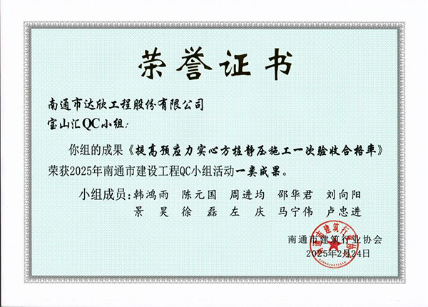 2月24日,南通市建筑行業協會發布2025年南通市工程建設質量管理小組(QC 小組)活動評價結果,公司寶山區大場鎮 W12-1301 單元 32-04 地塊項目寶山匯 QC 小組選送的《提高預應力實心方樁靜壓施工一次驗收合格率》成果,榮獲一類成果。