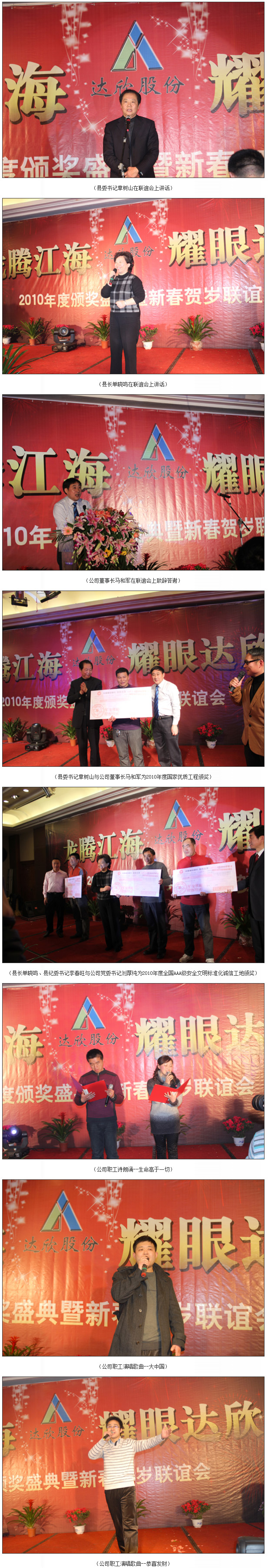 在喜慶樂典和主持人高亢激昂的道白后,首先回睦了2010年公司精彩的展示專題片,公司董事長馬和軍隨后進行了致辭答謝。他回顧了公司一年來所取得的輝煌成績,感謝社會各界及公司全體同仁們的努力,并對公司的未來發展之路描繪了藍圖;接著,縣委書記章樹山發表重要講話,他指出,建筑業是我縣的傳統產業,也是一個富民強勢產業,還是我縣財政收入的重要來源之一,作為縣內的骨干企業,達欣公司步入了公司歷史以來發展最快、榮譽最高、分配最多、貢獻最大的時期,他希望公司要加快發展,高起點定位,突出重點,好中求快,實現達欣新飛躍。