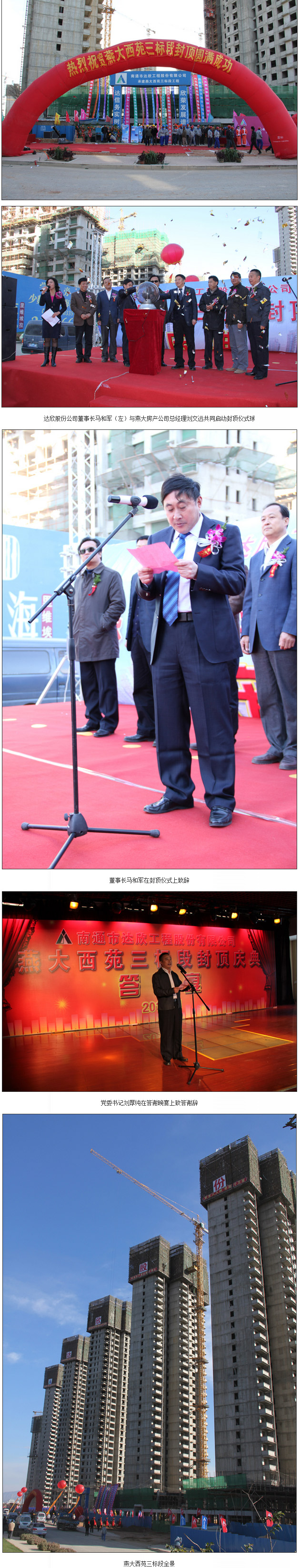 2009年11月10日,我公司承建的河北省秦皇島市燕大西苑三標段工程(5棟框剪結構住宅樓及地下車庫、商業,地上34層,地下2層,總建筑面積96151㎡)在燕大房地產開發有限公司負責人刑廣忠的一聲號令下啟動了開工儀式,2010年11月8日,由我公司董事長馬和軍與燕大房地產開發有限公司總經理劉文遠共同啟動封頂儀式球,宣布燕大西苑三標段提前圓滿封頂。