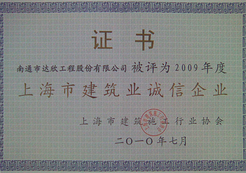 2010年7月30日,2009年度上海市建筑施工企業綜合實力及上海市建筑業誠信企業頒獎大會在青松城會議中心召開。出席會議的有上海市建委、上海市建管辦、市場管理總站、施工行業協會、各省滬辦領導以及獲獎企業共四百多人參加。