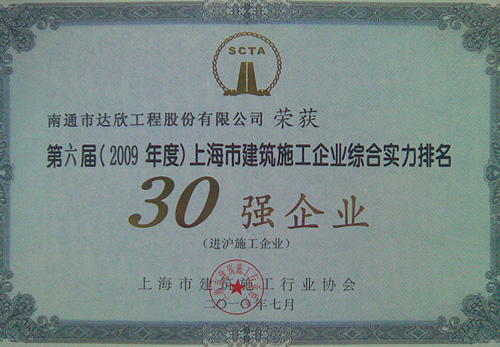 達欣股份榮獲上海市建筑施工企業綜合實力30強企業稱號