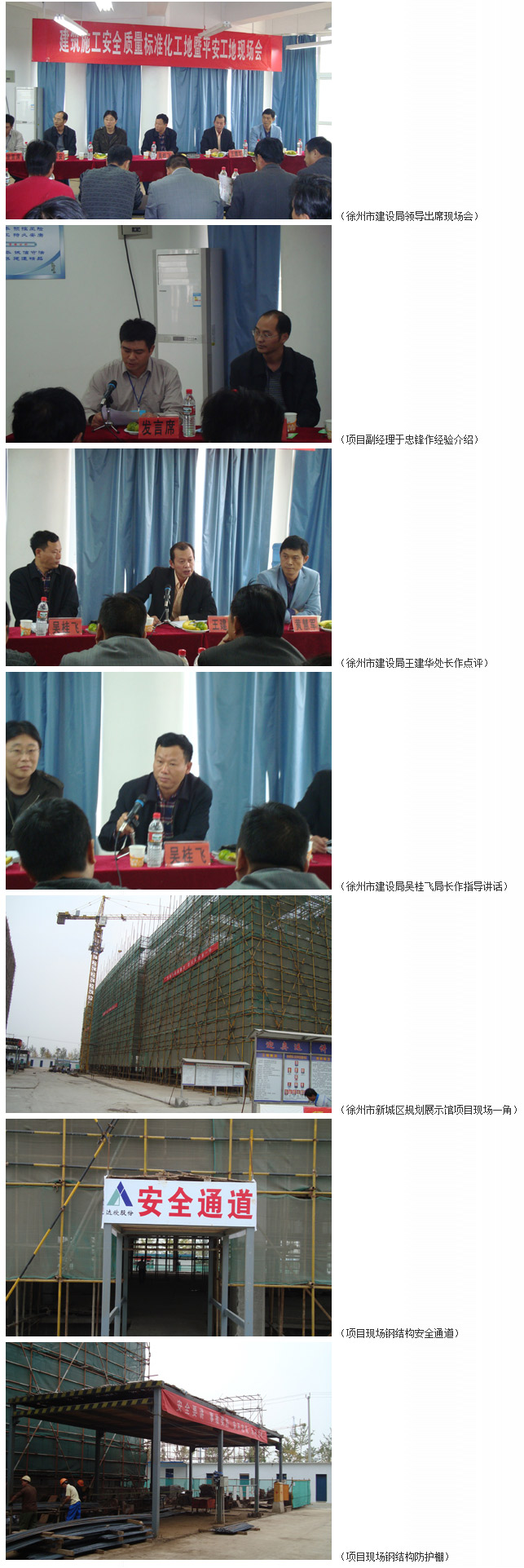 徐州市建設局安監處王建華處長在講話中對本工程“創質量安全標準化、平安工地”給予了高度評價,并總結了“八大亮點”:1、現場道路及場地硬化到位;2、農民工學校的內容具體、真實;3、現場的警示標志形象、生動,有特點;4、腳手架搭設規范;5、現場排水溝及集水井嚴格按照JGJ59—99的要求設計、施工;6、定型化產品(組裝式鋼結構防護棚)的投入使用;7、現場的臨邊防護規范;8、設置曝光欄有特點,做到處罰有根據。