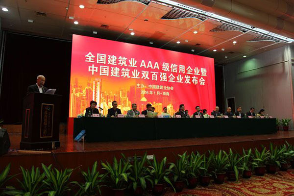 2016年1月7日,為展示全國建筑業AAA級信用企業和中國建筑業雙百強企業品牌形象,弘揚誠信經營、追求卓越的行業風氣,中國建筑業協會在珠海召開2015年度全國建筑業AAA級信用企業暨2014年度中國建筑業雙百強企業發布會。中國建筑業協會會長王鐵宏、副會長兼秘書長吳濤出席會議,副秘書長李蓬主持會議。廣東省住房城鄉建設廳黨組副書記、巡視員陳英松致歡迎辭,各地區和有關行業建設協會和企業代表等共400余人參會。